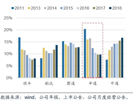 這直接使申通快遞市占率從2011年的全市場第一,超過20%一路下滑到2017年全市場第四不到10%。
